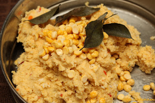 To the ground mixture add the 2 tsp channa dal which was soaked separately along with ginger, curry leaves, coriander leaves and asafoetida. Mix well.