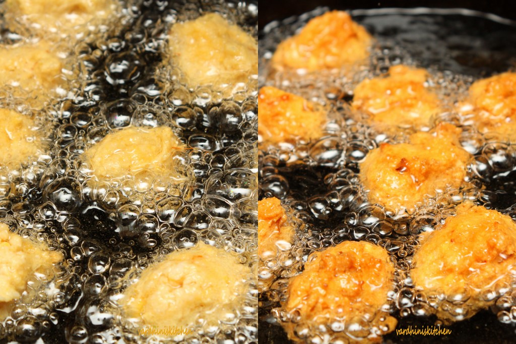 Soak the dals and rice for a couple of hours. Grind coarsely along with salt and chillies without adding much water. We should be able to make small balls with it.