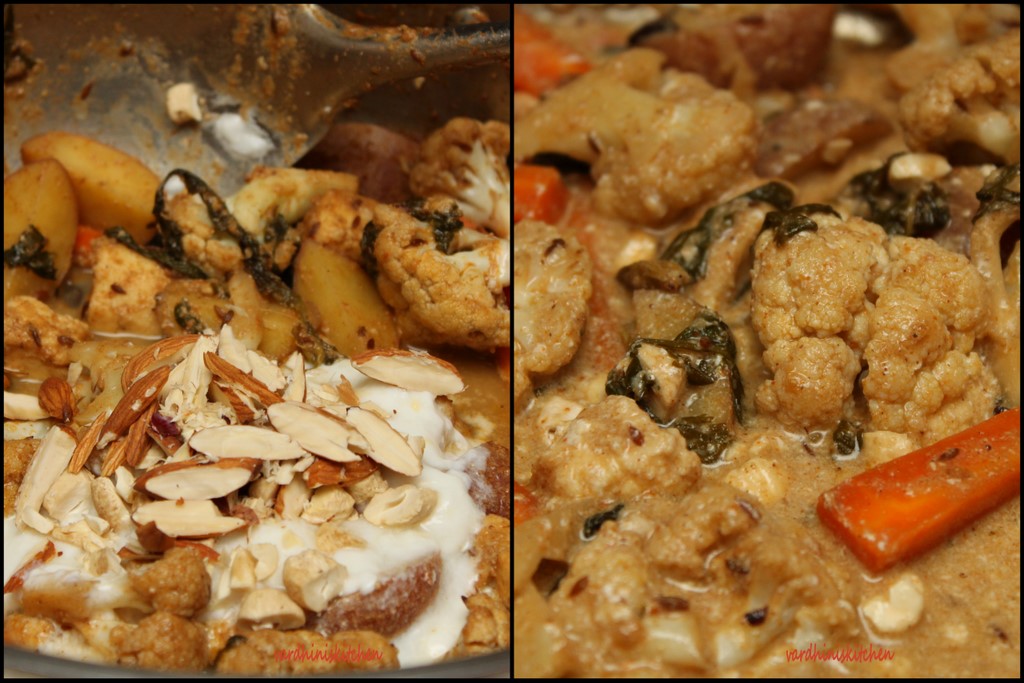 By now the vegetables are done. Separate the vegetables into 2 portions. To one portion add the remaining yogurt and nuts. Mix. Turn off the stove after few minutes.