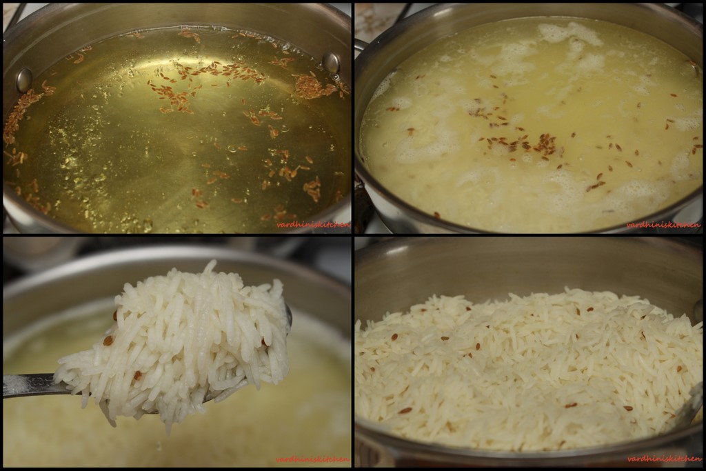 Meanwhile let us get the rice going. Bring a pot of water to a boil. Add cumin followed by the rice. Cook until 70% done since we do not want the grains to become mushy.