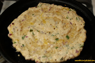 Heat a tawa and pour a ladleful of the batter and spread it around. Pour a tsp of oil around the edges and on top. Let it cook for few minutes.