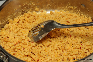 Heat a pan and season with mustard seeds. Add the lentil crumble. Saute for few minutes but if you want a crisper crumble saute longer.