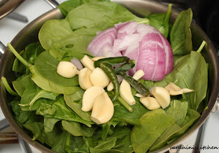 There is really nothing much to this recipe. Boil the spinach, garlic, green chillies and onion along with salt.