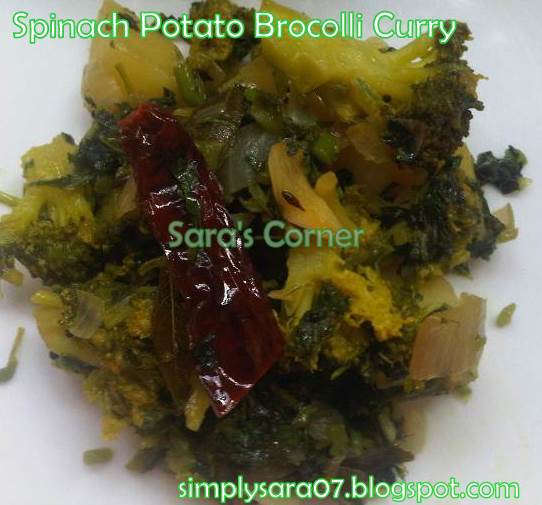 Saraswathi of ‘Sara’s Corner’ has sent us this healthy Spinach Potato Broccoli Curry which includes the goodness of spinach and broccoli combined.
