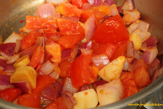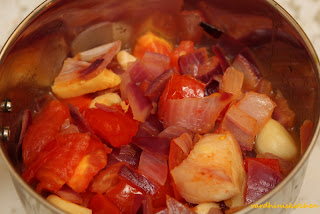 Tomatoes are mushy and onions are also cooked.