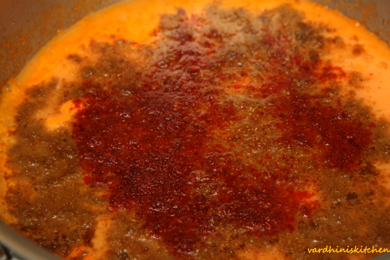 Add the spice powders (turmeric, red chilly powder, cumin powder, coriander powder) and salt.