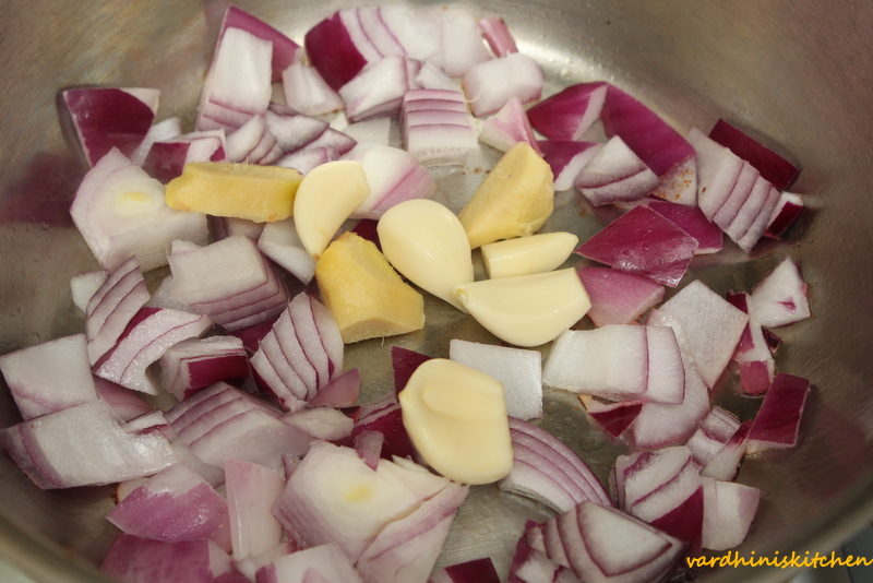 Next to the same vessel add onions, ginger and garlic.