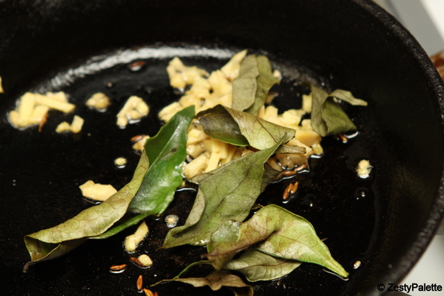 Add the pepper-cumin mixture, ginger and curry leaves to the fermented batter. Add a tsp of ghee if using.