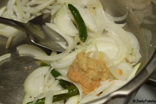 Heat oil in the pressure pan. Add cloves and cinnamon followed by onion, chillies, ginger and garlic paste.