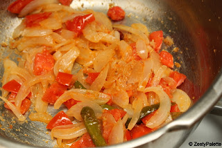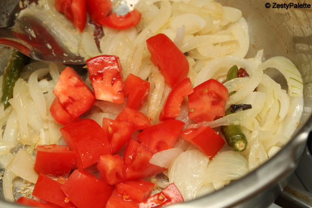 Saute until the onions are done. Add the tomatoes.