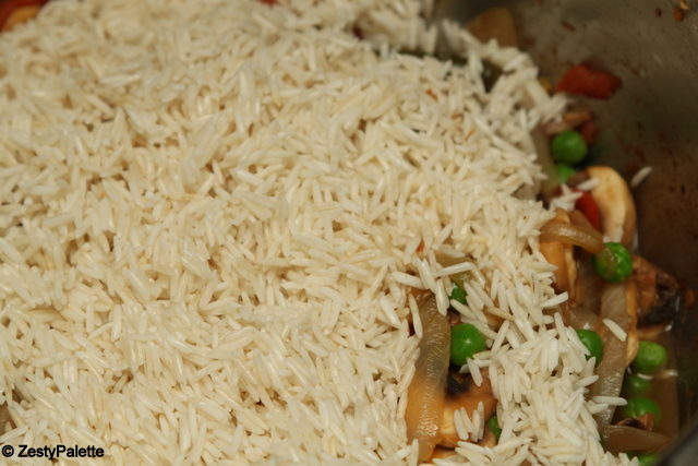 I have used mushrooms and peas, but feel free to add any vegetable on hand along with mushrooms. This is perfect for a weeknight dinner as it takes less time to prepare and cleanup is a breeze too. Off to the tasty pulao.