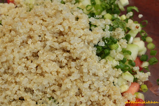 I came across Tabbouleh while casually cruising through the recipe cards in the grocery store. After reading about the health benefits of quinoa, I am always on the lookout for ways by which I could use quinoa. So here I have substituted bulgar wheat with quinoa, used cilantro instead of parsley and omitted mint as I was out of it. The result was a refreshing and healthy salad with the goodness of quinoa and vegetables.