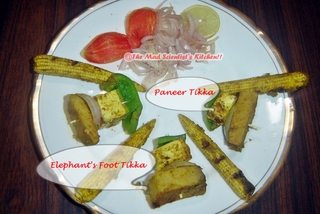 Archana of ‘The Mad Scientist’s Kitchen!!’ sends us Grilled Paneer Grilled Elephant’s Foot Grilled Baby Corn. She says ‘we can cook healthy and tasty at the same time’.
