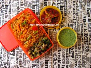 Harini of ‘Sugar ‘n’ Spice’ has sent us Bread Chaat. She has also given the recipe for various chutneys. Who could resist this?