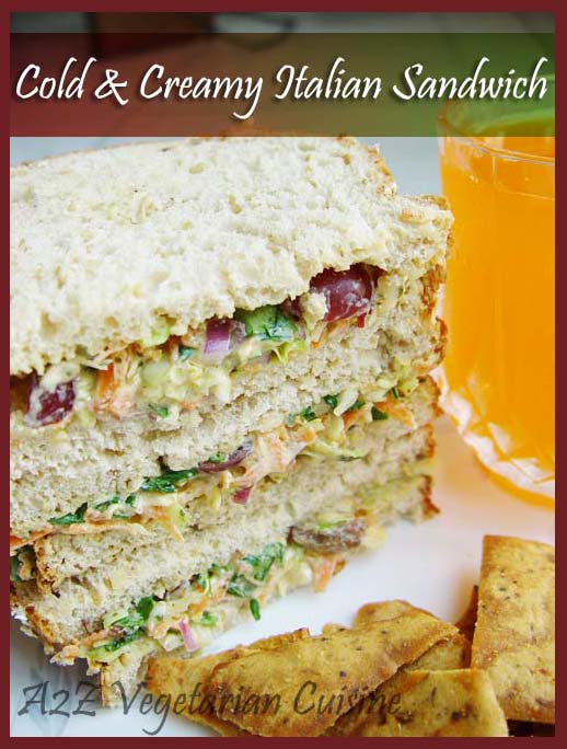 Muskaan of ‘A2Z Healthy Vegetarian Cuisine’ has sent us Cold & Creamy High Protein Lowfat Italian Sandwich. The picture says it all .