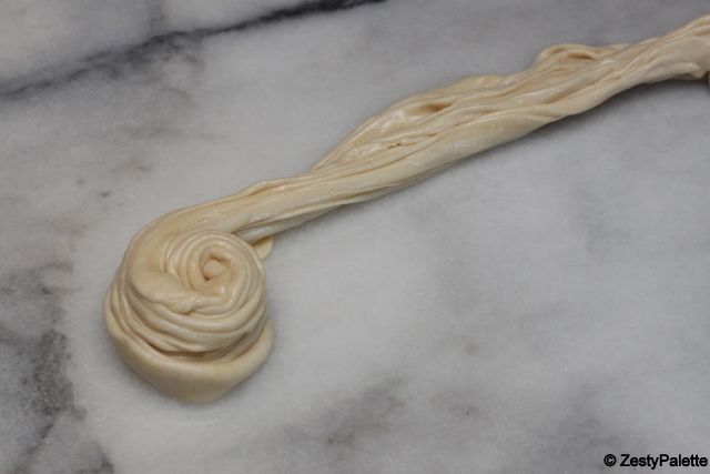 I had to go over it a couple times from the photograph of the rolled out thinly dough with the hand over it. The next picture showed strands intertwined and I got confused. My spouse says to just fold a small pleat from the edge, reverse a fold etc until all rolled up.
