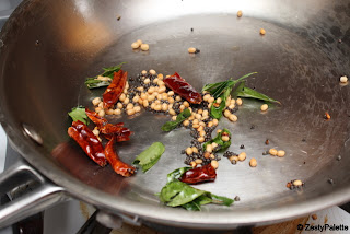 Heat oil and add mustard seeds. When it splutters, add urad dal, red chillies and curry leaves.