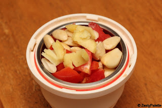 Take the ingredients mentioned under masala. (Peeled almonds, tomato, ginger, garlic and red chillies.)