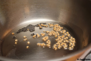 Heat oil and add mustard seeds. When they pop, add the urad dal. Fry till the dal turns golden brown.