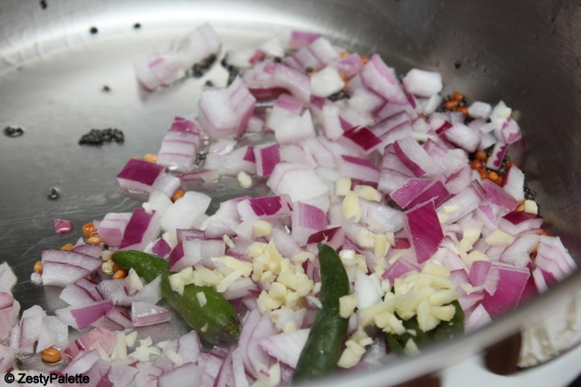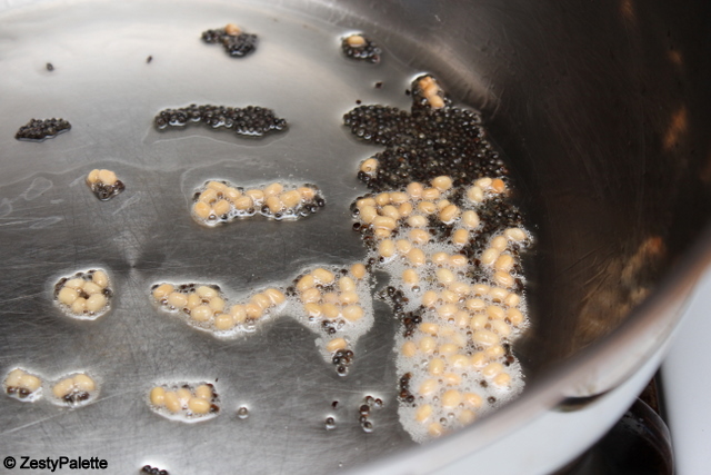 Heat oil and add mustard seeds. When they pop add the urad dal.