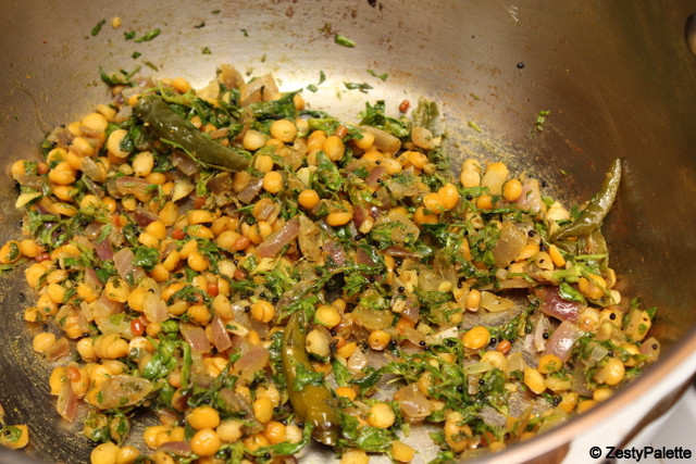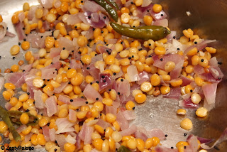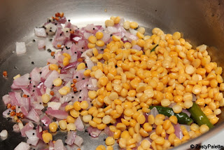 When the dal turns golden brown add the onions, garlic and green chillies.
