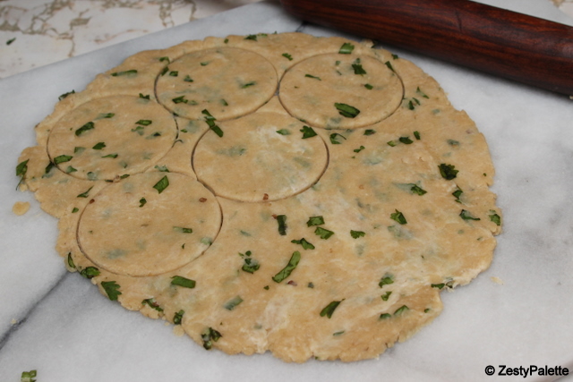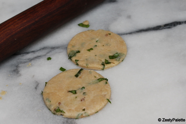 The biscuits had a slight tinge of sweetness along with the heat from chillies and was delicious. You could certainly try a whole bunch of variations by adding your favorite spices and herbs. Next time I will add some cumin seeds or sesame seeds. Overall tea time was much more enjoyable with these biscuits and my 3 yr old was behind me asking for more. Off to the pictorial.