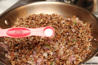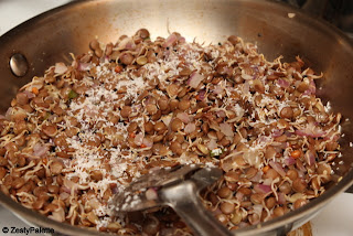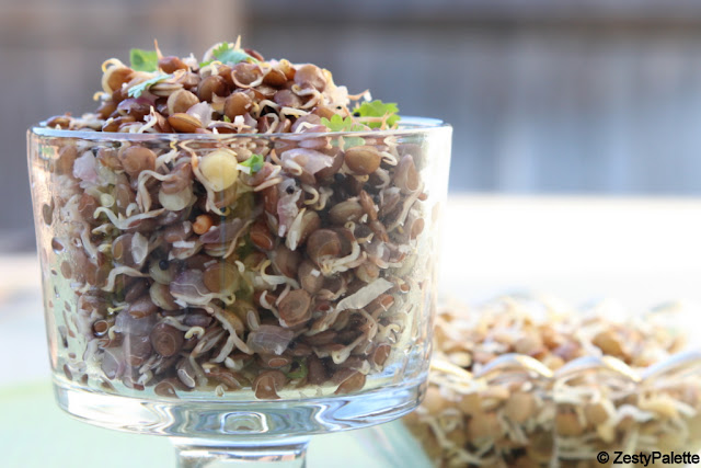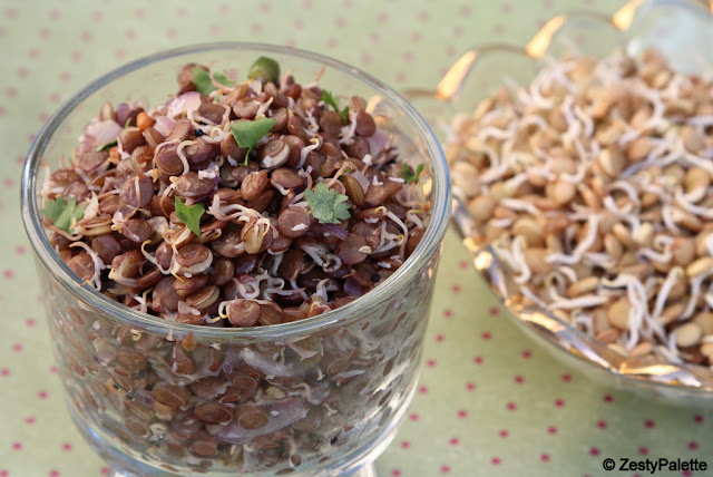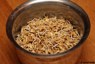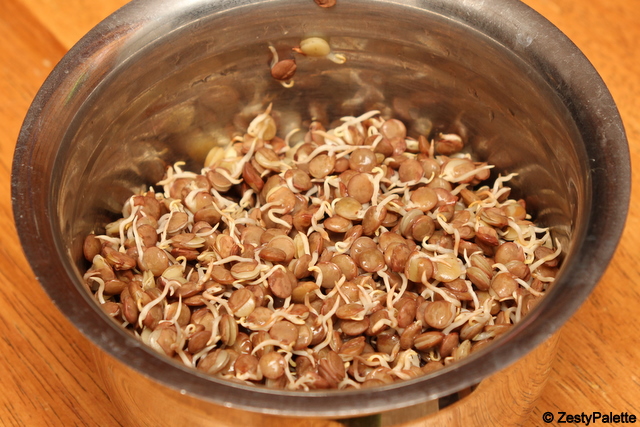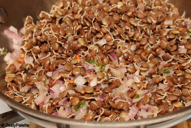 Prepare lentil sprouts similar to moong sprouts. Take in a vessel and pressure cook for 3 whistles. (About 10-15 minutes.)
