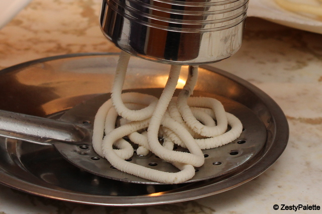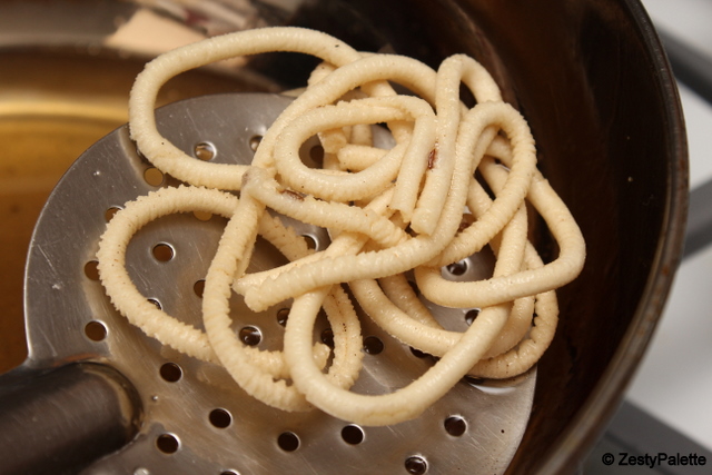 Load the murukku maker with a portion of the dough and form the murukkus. I normally do this directly over the oil, but since I was taking pictures I am doing it over a ladle. You can do it either way.