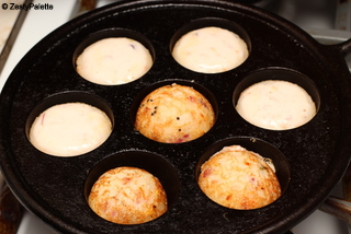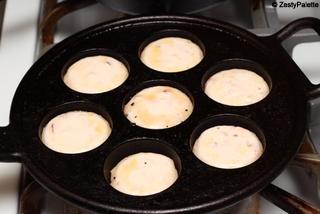 Heat a kuzhi paniyaram pan and pour 1/4 tsp oil in each groove. Pour the batter in the grooves. Keep the heat at a medium so that the inside gets cooked properly.