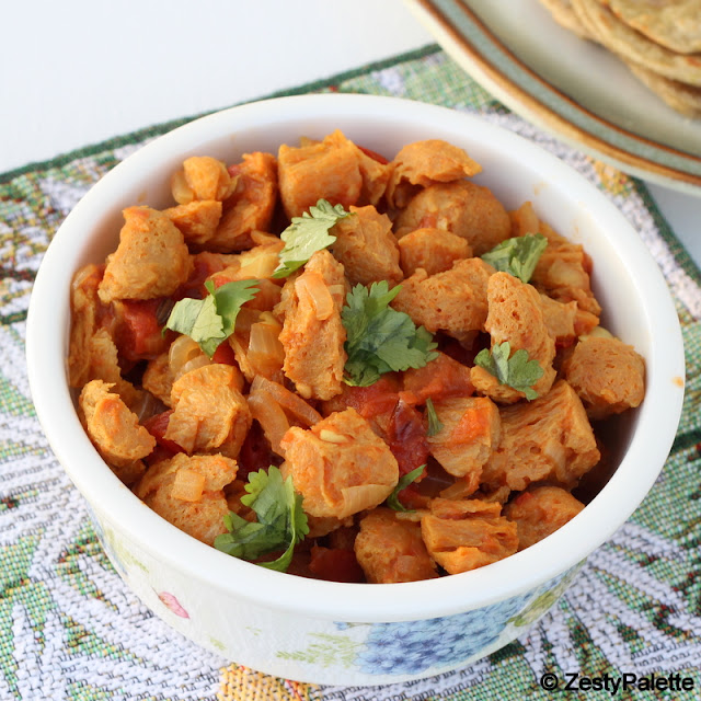 This is a dish that I specifically made for my Dish-it-Out after a chit chat with my mom. While I was talking to her about the items I have chosen to blog for the guilt free snacks theme next week the conversation moved on to soya chunks. I asked her if she does anything different with them apart from rice. She immediately mentioned this curry and since it also had tomatoes, it became a perfect entry for the event.