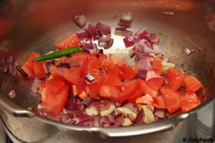 Add onions, garlic and green chillies. Saute until the onions are cooked.