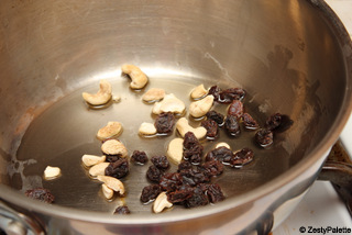 In a vessel, heat ghee and roast the cashews and raisins.