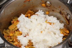 Now add the cooked rice. I had leftover sona masoori rice and I have used that. Mix gently..