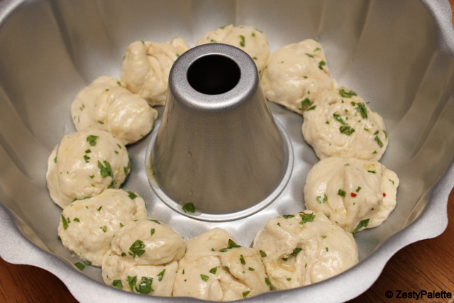 After all the festival recipes I certainly needed a change. I have always been fascinated by bundt cakes and purchased the pan. I was not able to narrow down any recipe and with all the festival recipes I did not find time to bake and the poor pan was tucked away neatly in the cabinet. So when I saw this pull-apart bread made using a bundt pan I was simply carried away as it was a win-win situation for me. I get to bake my favorite bread and also use the pan. No worries if you don’t have a bundt pan, you can arrange the balls in any baking pan. In the end all which matters is the taste and not the shape of pan used right?