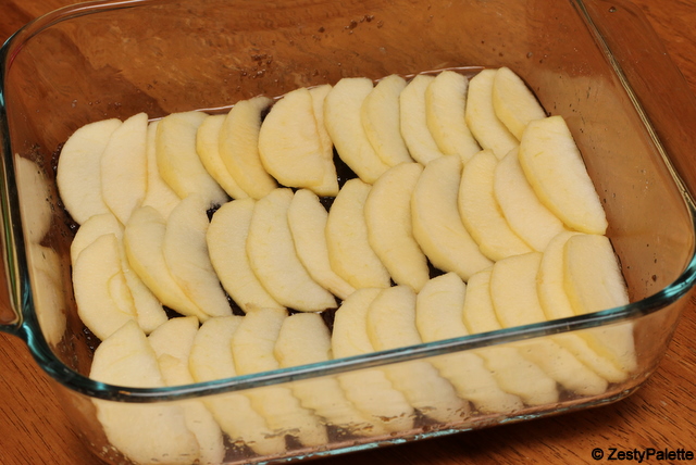 Place thinly sliced apples over the butter-sugar mixture.