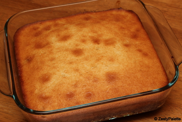 Pour the mixture over the apples in the cake pan. Bake in a preheated 375F oven for 30 – 35 minutes until a tooth pick inserted in center of cake comes out clean.